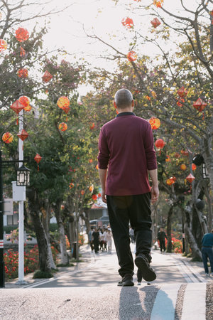 Elderly man walking down lantern-decorated street in traditional district, back view under autumn trees