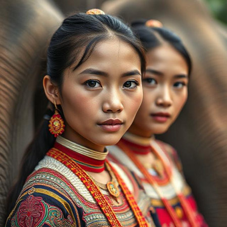 A vibrant scene of the Mon people showcasing their traditional costumes and crafts.