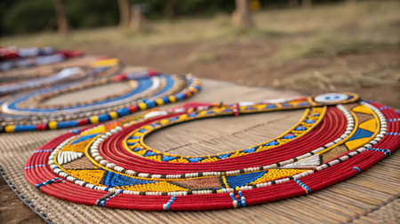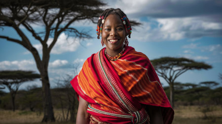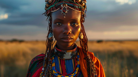 A woman adorned in colorful traditional attire stands gracefully in the savanna, showcasing intricate beaded jewelry and a vibrant collar against a setting sun.
