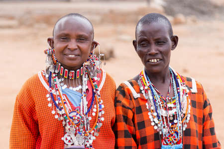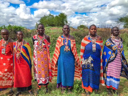 AFRICA, KENYA, MASAI MARA, MARCH, 2016 - Masai women in multi-colored cotton dresses and beaded jewelry in his village, Masai Mara, Kenya, Africa