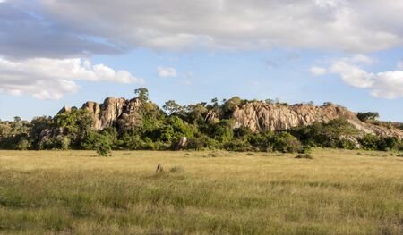 African dry hot savanna with dried plants and mountains in the background