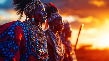 Maasai warriors perform traditional love rituals against the backdrop of a beautiful sunset in East Africa.
