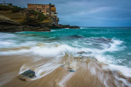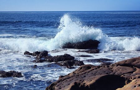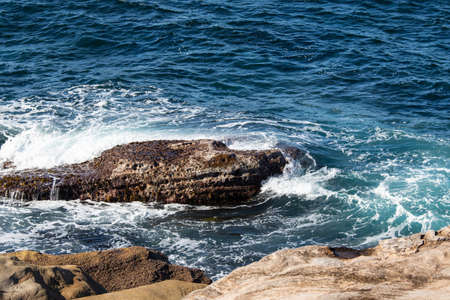 Waves crashing on cliffs along the Pacific Ocean at Sunset Cliffs Natural Park, Point Loma, California.