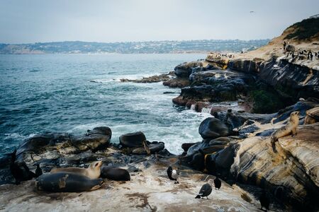 Birds and sea lions on rocks along the Pacific Ocean, in La Jolla, California.