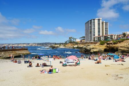 Beachgoers enjoying a beautiful sunny day at La Jolla Cove in San Diego, California, USA. August, 22nd, 2019