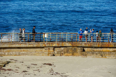 La Jolla, San Diego, CA USA -24 JAN 2020: Group of people walking on steep high cliff promenade, multiethnic pedestrians, tourists during holidays. Succulents and ocean, golden sunset in California.