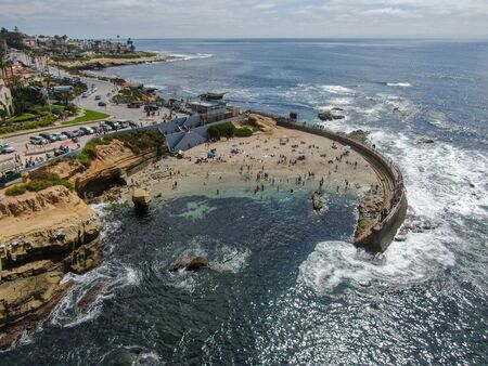 Aerial view of La Jolla Cove, small picturesque cove and beach surrounded by cliffs, San Diego, California. Protected marine reserve, popular with snorkelers and swimmers. Travel destination.