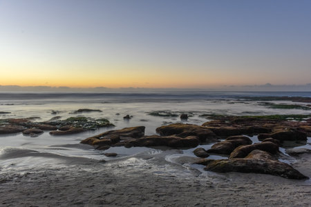 Rocks at Shore San Diego California Beach wit sun setting down