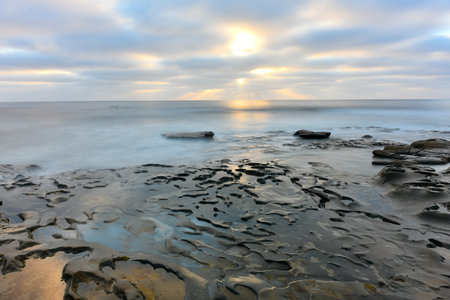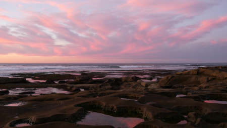 Eroded rock formation, tide pool shape in La Jolla, California coast, USA. Littoral intertidal zone erosion, tidepool relief. Sunset sky reflection in water, cavity, hollows and holes on stone surface