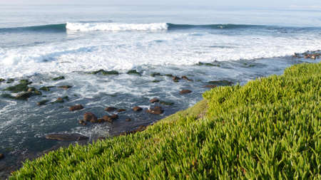 Green pigface sour fig succulent over pacific ocean splashing waves. Ice plant greenery on the steep cliff. Hottentot sea fig near waters edge, vista point in La Jolla Cove, San Diego, California USA.