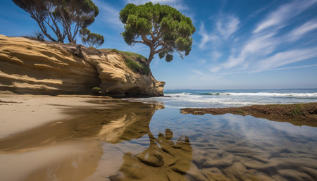Tranquil scene, waters edge, reflection, sunrise, cliff generated by artificial intelligence