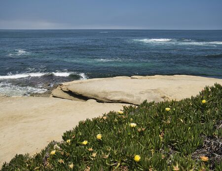 Ocean waves crashing on beach, sea water surface from above, eroded cliff of La Jolla shore, California pacific coast, USA. Seascape natural background. Erosion of bluff on coastline. Flowers greenery