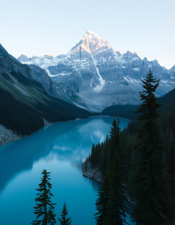 Majestic snow capped mountain peaks towering above a pristine glacial lake with the peaks perfectly reflected in the calm mirror like waters This breathtaking