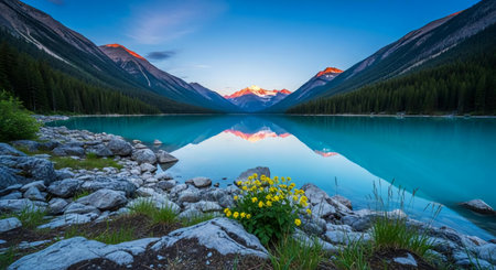 a breathtaking sunset over a serene lake reflecting the majestic mountains and sky above.