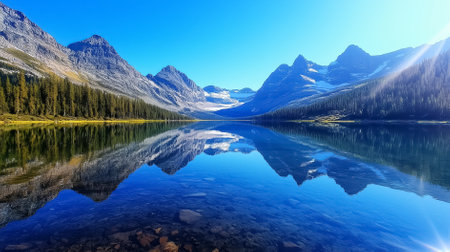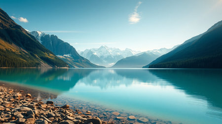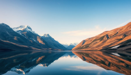 a serene lake reflects majestic mountains under a clear sky, a tranquil nature scene.