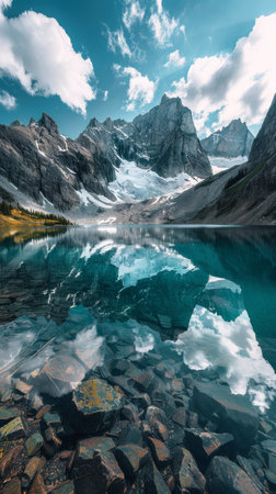 Glassy Mountain Lake with Snowy Peaks A perfectly still mountain lake reflects the towering snow-capped peaks above, creating a near-perfect