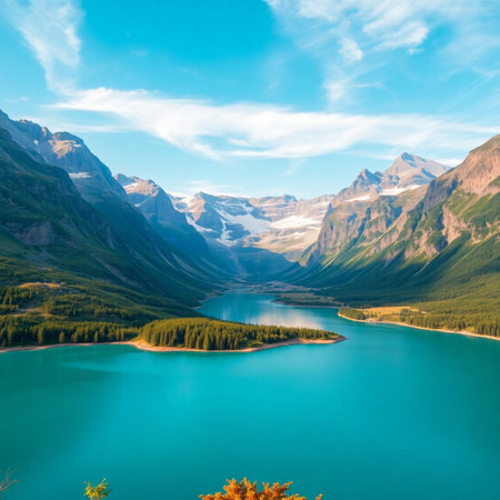 A pristine mountain lake reflects the stunning alpine landscape surrounded by towering peaks and vibrant green forests. The tranquility invites outdoor exploration and relaxation.