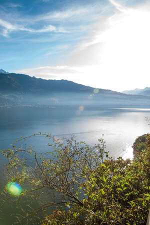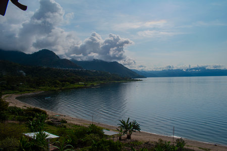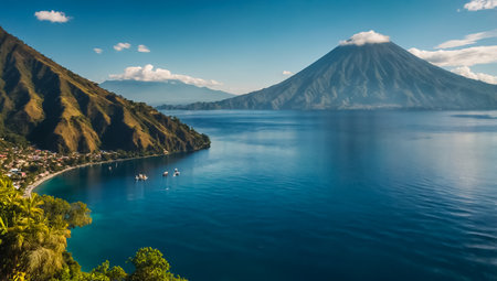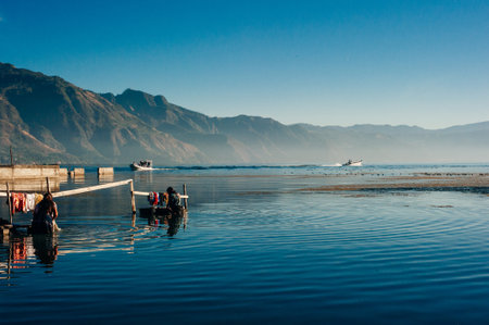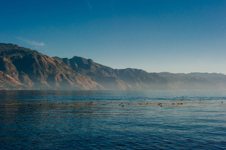 View from Lake Atitlan in the early morning, blue skys and clear water, beautiful magic lake with volcanos and indigenous people in the highland of Guatemala