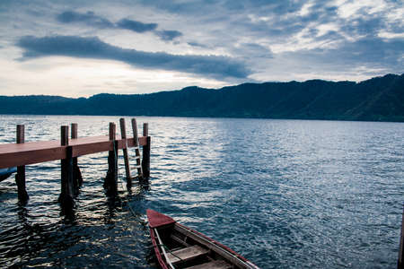Boat at wooden jetty along lake Atitlan at the coast of Santa Cruz la Laguna, Guatemala