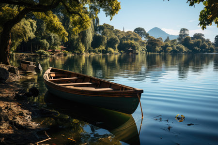 Serene scene in Uhuru Park, Arusha Lake, Pavilion, Boat, Mount Meru., generative AI