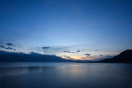 Sunrise in Atitlan, Solola, Guatemala, view of sunrise and reflections in the lake and mountains and volcanoes in the background.