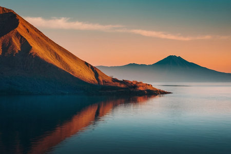 Sunset view of volcanic peaks reflecting on a calm lake with surrounding trees. the vibrant sky displays warm colors, contrasting with the serene water and rugged mountains, offering a peaceful landscape ideal for nature lovers and posters.