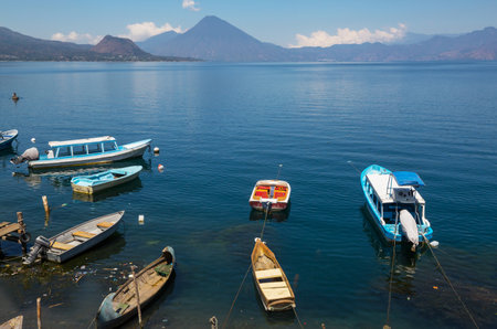 Beautiful outdoor view of small boats in Atitlan Lake is the deepest lake in all of Central America with a maximum depth of about 340 meters, with volcano in Background in Guatemala.