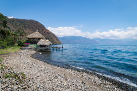 Jetty hut with straw roof at the stone beach of lake Atitlan with background mountain range at Santa Cruz La Laguna, Guatemala