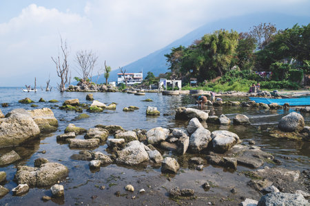 San Pedro la Laguna, Guatemala - 26 March 2018: Beach at lake atitlan with local people fishing and doing laundry along volcano