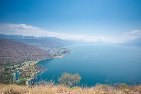 Viewpoint at lake Atitlan - view to the small villages San Marcos, Panajachel and San Marcos at the lake in the highlands of Guatemala