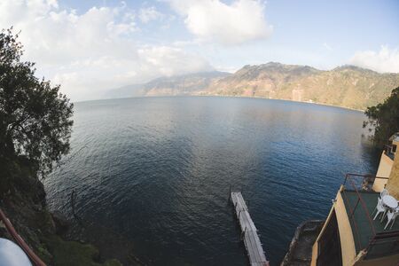 Boat dock in foreground and cloud-covered volcanic mountains in the distance at Lake Atitlan, Guatemala, Central America.