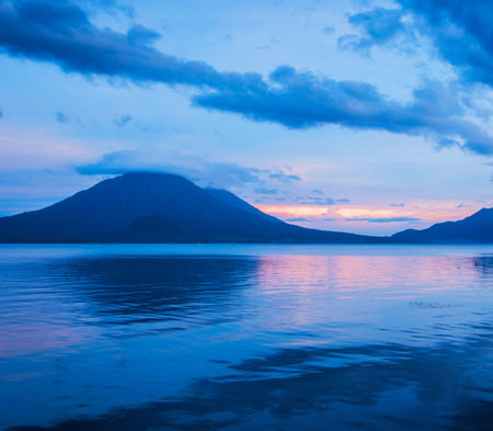 Evening view of the silhouette of San Pedro volcano, looking over the Atitlan Lake in Guatemala. Interesting cloud formations over the volcano.