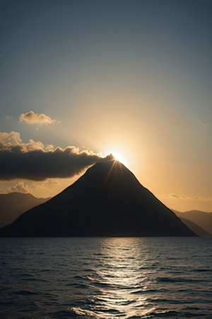 Stunning View of Majestic Volcano over Tranquil Lake beneath a Blue Sky and Clouds