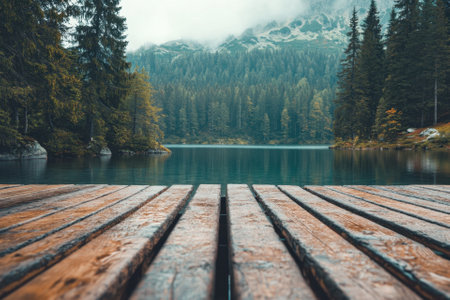 Wooden dock overlooking a tranquil mountain lake in a misty forest.