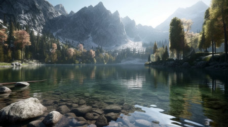Serene lake surrounded by dramatic mountain cliffs, reflecting vibrant colors of nature. clear water reveals smooth stones beneath, creating tranquil atmosphere in this picturesque alpine setting