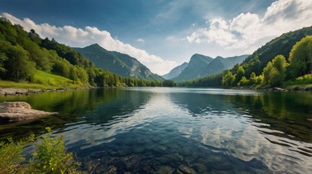 A body of water surrounded by trees and mountains. AI generative image.
