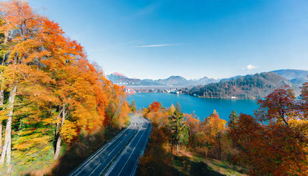 Scenic view of Lake Bled and the castle with colorful autumn foliage, Slovenia, Europe
