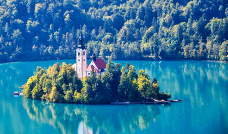 Lake Bled Slovenia island. Alpine lake with island in Europe.