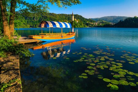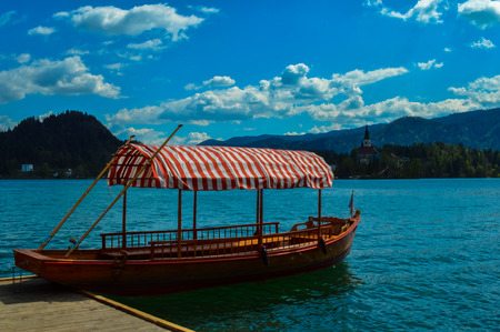 Traditional touristic wooden Pletna boat anchored at the pier on the lake. Pletna rowing boat on the alpine Bled lake and Pilgrimage church in background, Bled, Slovenia, Europe