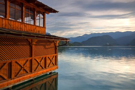 Autumn sunset lake Bled, church of Assumption of Mary Pilgrimage on island, swimming boat in Slovenia. Fall landscape over Blejsko jezero, mountains in cloud, pletna on water in Carniolan Slovenija