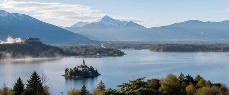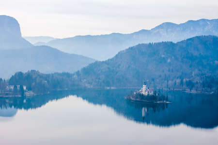 Bled, Slovenia. Panoramic view of Bled lake in the morning, Slovenia. Fog over the island with church. Famous church in the mountains