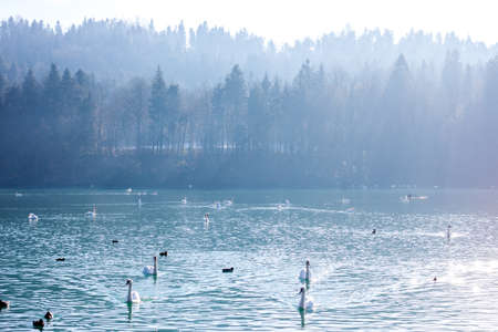 Beautiful foggy sunrise the Bled lake on autumn in Slovenia,Europe
