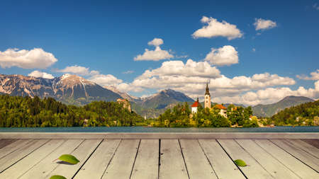 Empty wooden table in front of abstract blurred background in nature, can be used for display or montage your products. Mock up for display of product. Bled island in the background from Slovenia.