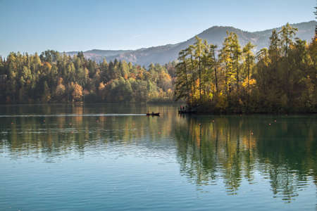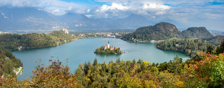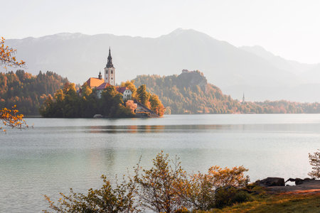 Autumn lake Bled, church of Assumption of Mary Pilgrimage in Slovenia. Fall serenity scenic with Santa maria (Our Lady) chapel on island and Karawanks mounts range in Upper Carniola, Slovenija