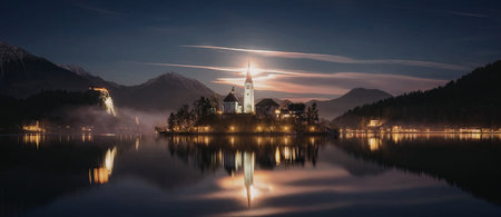 A tranquil lakeside scene featuring a beautifully lit church surrounded by mountains and misty reflections in the calm water.