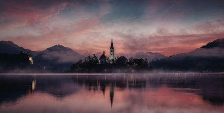 Fantastic sunrise on Bled lake. Misty morning view of church of Assumption of Maria on Bled lake. Foggy autumn landscape in Julian Alps, Slovenia, Europe. Traveling concept background.
