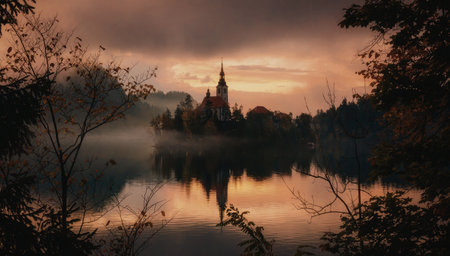 A tranquil lake reflects a picturesque church and surrounding trees during a vibrant sunset, with mist gently hovering over the water.