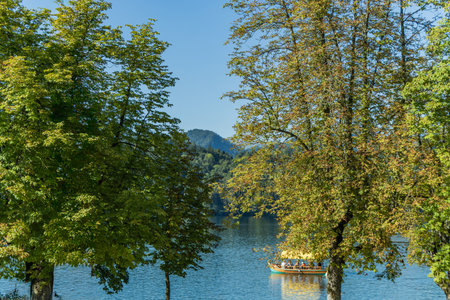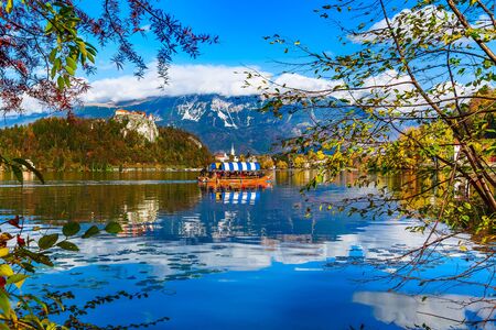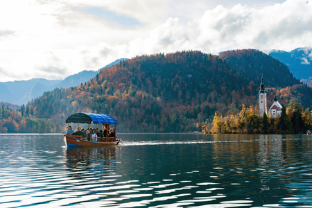 Bled, Slovenia - October 31, 2018: Lake Bled with tourists in wooden Pletna boat, castle and autumn colorful trees background