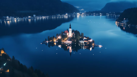 Generative AI : Aerial view of the island Blejski otok in Bled Slovenia