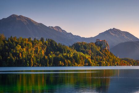 Autumn lake Bled, church of Assumption of Mary Pilgrimage, castle on cliff in Slovenia. Santa maria chapel on island, medieval palace Burg Veldes on hill, mounts in colorful national park in Slovenija